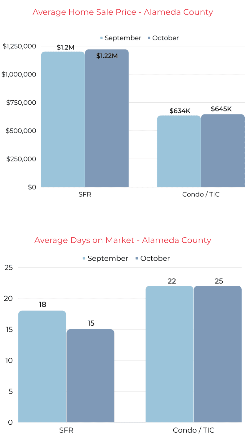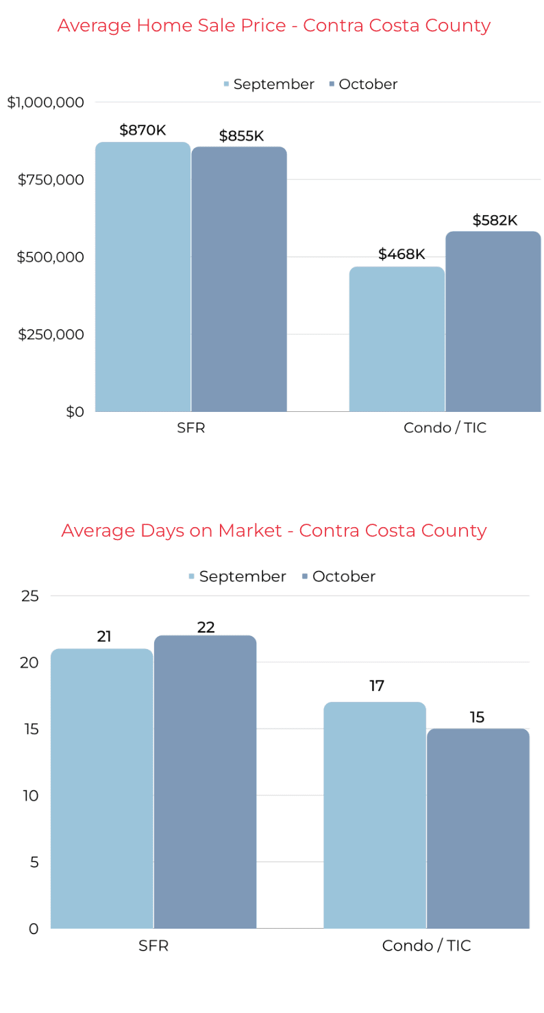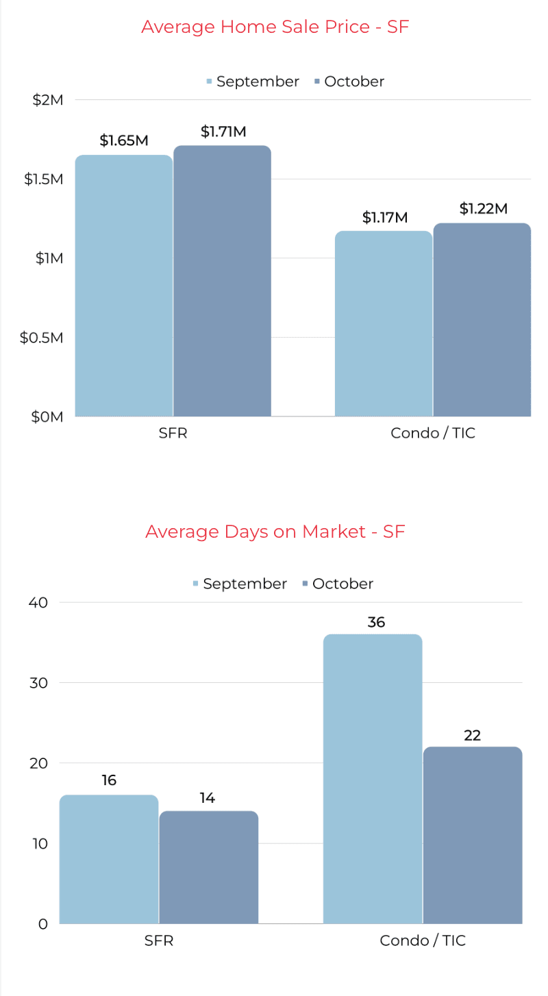 As expected, available listings dipped in October since September is traditionally the peak of the Fall market when it comes to inventory. It is worth noting that this October has seen the lowest levels of inventory in the past 5 years. In more positive news, average sales prices have experienced an overall bounce back from the lulls of Summer. In general, prices are now at levels 10% under the peaks we saw in April. Market stabilization benefits everyone, so I am pleased to see this for my clients. Properties are selling faster, especially condos and this may be one of the first months since Covid that we are seeing pre-pandemic levels of condo inventory during the busy season. Other signs of market stabilization: properties are selling at an average of just 2% over asking in San Francisco and we are at up to 3 months of inventory which is typical for the area (although on the high side). Lastly, we’ve now had 3-4 months of relatively stable prices per sqft, a further indication of a stabilizing market.