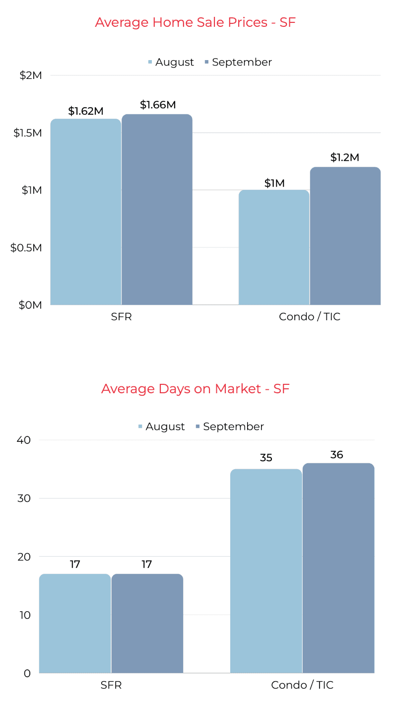 We are experiencing an increase in new inventory of homes at every price point in the SF market combined with an uptick in new buyer interest. September experienced a 70% increase of homes available on the market, the first time we've seen an increase in over 6 months! Listings sold continued to decline over the past four months, but are holding steady at pre-covid levels. For the past five months, the percentage of homes selling over asking is declining in SF. Less than half the properties in SF sell for over asking, with 67% of those being houses. Price per square foot has been decreasing since March and prices in SF are at 2018/2019 levels on average.